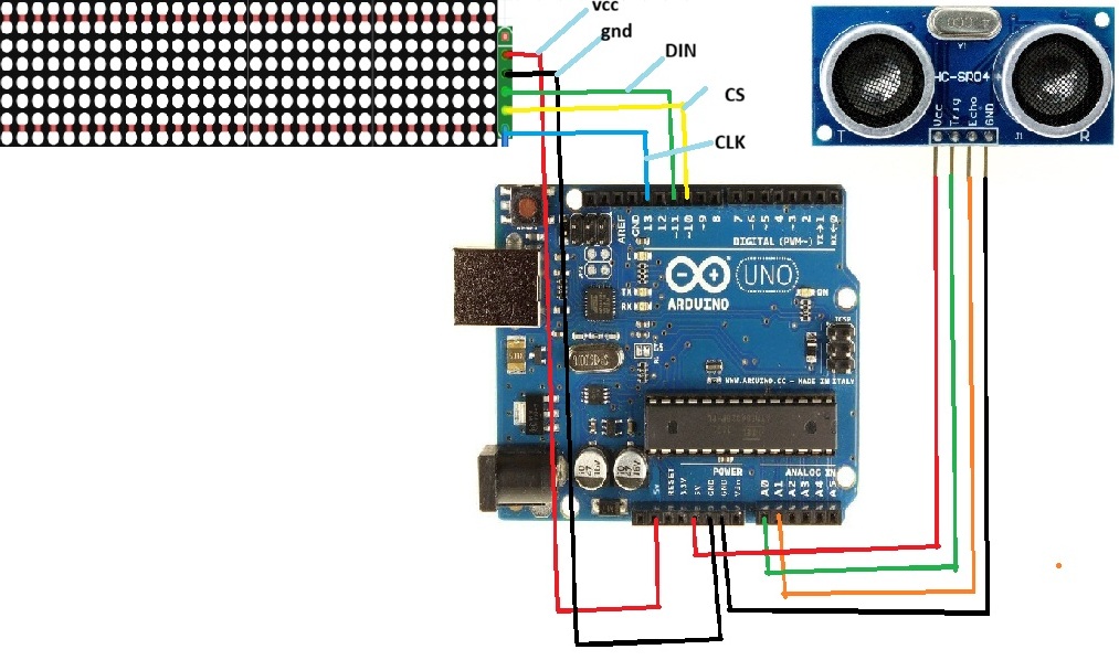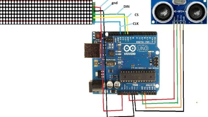 Arkadaşlar merhaba bu projemizde arduino uno 4 x 8×8 dot matrix ve hc -sr04 mesafe sensörü kullanarak boy ölçer yapacağız öncelikle bağlantımızı yapalım